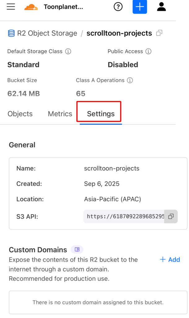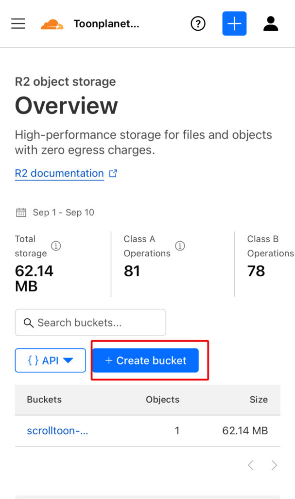 R2 では「バケット」というフォルダを作ります。例:scrolltoon-projects